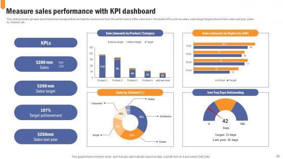This slide provides glimpse about dashboard analysis that can help the business to track the performance of the sales team. It includes KPIs such as sales, sales target, target achievement, sales last year, sales by channel, etc. The best PPT templates are a great way to save time, energy, and resources. Slidegeeks have 100 percent editable powerpoint slides making them incredibly versatile. With these quality presentation templates, you can create a captivating and memorable presentation by combining visually appealing slides and effectively communicating your message. Download Measure Sales Performance With KPI Developing Extensive Sales And Operations Strategy Brochure Pdf from Slidegeeks and deliver a wonderful presentation. This slide provides glimpse about dashboard analysis that can help the business to track the performance of the sales team. It includes KPIs such as sales, sales target, target achievement, sales last year, sales by channel, etc.
