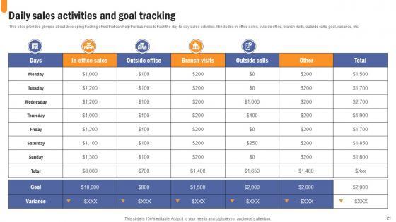 This slide provides glimpse about developing tracking sheet that can help the business to track the day-to-day sales activities. It includes in-office sales, outside office, branch visits, outside calls, goal, variance, etc. If your project calls for a presentation, then Slidegeeks is your go to partner because we have professionally designed, easy to edit templates that are perfect for any presentation. After downloading, you can easily edit Daily Sales Activities And Goal Tracking Developing Extensive Sales And Operations Strategy Elements Pdf and make the changes accordingly. You can rearrange slides or fill them with different images. Check out all the handy templates. This slide provides glimpse about developing tracking sheet that can help the business to track the day-to-day sales activities. It includes in-office sales, outside office, branch visits, outside calls, goal, variance, etc.