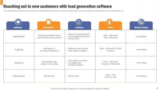 This slide provides glimpse about analyzing various software tools that can help the business in lead generation. It includes software, description, features, price, market ratings, etc. Slidegeeks has constructed Reaching Out To New Customers Developing Extensive Sales And Operations Strategy Inspiration Pdf after conducting extensive research and examination. These presentation templates are constantly being generated and modified based on user preferences and critiques from editors. Here, you will find the most attractive templates for a range of purposes while taking into account ratings and remarks from users regarding the content. This is an excellent jumping off point to explore our content and will give new users an insight into our top notch PowerPoint Templates. This slide provides glimpse about analyzing various software tools that can help the business in lead generation. It includes software, description, features, price, market ratings, etc.