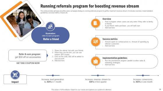 This slide provides glimpse about the sales campaign strategy by running referrals program to get the maximum revenue stream. It includes overview, implementation guidelines, success metrics, impact, etc. Presenting this PowerPoint presentation, titled Running Referrals Program For Boosting Developing Extensive Sales And Operations Strategy Themes Pdf, with topics curated by our researchers after extensive research. This editable presentation is available for immediate download and provides attractive features when used. Download now and captivate your audience. Presenting this Running Referrals Program For Boosting Developing Extensive Sales And Operations Strategy Themes Pdf. Our researchers have carefully researched and created these slides with all aspects taken into consideration. This is a completely customizable Running Referrals Program For Boosting Developing Extensive Sales And Operations Strategy Themes Pdf that is available for immediate downloading. Download now and make an impact on your audience. Highlight the attractive features available with our PPTs. This slide provides glimpse about the sales campaign strategy by running referrals program to get the maximum revenue stream. It includes overview, implementation guidelines, success metrics, impact, etc.