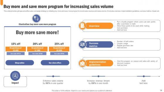This slide provides glimpse about the sales campaign strategy by initiating buy more and save more program to boost sales revenue and sales volume. It includes overview, implementation guidelines, success metrics, impact, etc. Get a simple yet stunning designed Buy More And Save More Program Developing Extensive Sales And Operations Strategy Portrait Pdf. It is the best one to establish the tone in your meetings. It is an excellent way to make your presentations highly effective. So, download this PPT today from Slidegeeks and see the positive impacts. Our easy to edit Buy More And Save More Program Developing Extensive Sales And Operations Strategy Portrait Pdf can be your go to option for all upcoming conferences and meetings. So, what are you waiting for Grab this template today. This slide provides glimpse about the sales campaign strategy by initiating buy more and save more program to boost sales revenue and sales volume. It includes overview, implementation guidelines, success metrics, impact, etc.