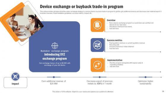 This slide provides glimpse about the sales campaign strategy by running device buyback trade-in program to get the get additional revenue and decrease raw material export. It includes overview, implementation guidelines, success metrics, impact, etc. Crafting an eye catching presentation has never been more straightforward. Let your presentation shine with this tasteful yet straightforward Device Exchange Or Buyback Trade Developing Extensive Sales And Operations Strategy Sample Pdf template. It offers a minimalistic and classy look that is great for making a statement. The colors have been employed intelligently to add a bit of playfulness while still remaining professional. Construct the ideal Device Exchange Or Buyback Trade Developing Extensive Sales And Operations Strategy Sample Pdf that effortlessly grabs the attention of your audience Begin now and be certain to wow your customers. This slide provides glimpse about the sales campaign strategy by running device buyback trade-in program to get the get additional revenue and decrease raw material export. It includes overview, implementation guidelines, success metrics, impact, etc.
