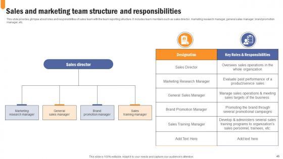 This slide provides glimpse about roles and responsibilities of sales team with the team reporting structure. It includes team members such as sales director, marketing research manager, general sales manager, brand promotion manager, etc. Here you can discover an assortment of the finest PowerPoint and Google Slides templates. With these templates, you can create presentations for a variety of purposes while simultaneously providing your audience with an eye catching visual experience. Download Sales And Marketing Team Developing Extensive Sales And Operations Strategy Themes Pdf to deliver an impeccable presentation. These templates will make your job of preparing presentations much quicker, yet still, maintain a high level of quality. Slidegeeks has experienced researchers who prepare these templates and write high quality content for you. Later on, you can personalize the content by editing the Sales And Marketing Team Developing Extensive Sales And Operations Strategy Themes Pdf. This slide provides glimpse about roles and responsibilities of sales team with the team reporting structure. It includes team members such as sales director, marketing research manager, general sales manager, brand promotion manager, etc.