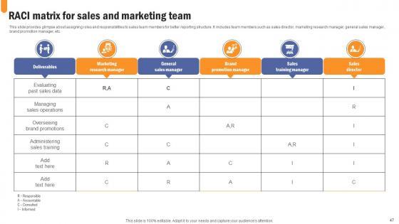 This slide provides glimpse about assigning roles and responsibilities to sales team members for better reporting structure. It includes team members such as sales director, marketing research manager, general sales manager, brand promotion manager, etc. Retrieve professionally designed RACI Matrix For Sales And Marketing Developing Extensive Sales And Operations Strategy Introduction Pdf to effectively convey your message and captivate your listeners. Save time by selecting pre made slideshows that are appropriate for various topics, from business to educational purposes. These themes come in many different styles, from creative to corporate, and all of them are easily adjustable and can be edited quickly. Access them as PowerPoint templates or as Google Slides themes. You do not have to go on a hunt for the perfect presentation because Slidegeeks got you covered from everywhere. This slide provides glimpse about assigning roles and responsibilities to sales team members for better reporting structure. It includes team members such as sales director, marketing research manager, general sales manager, brand promotion manager, etc.