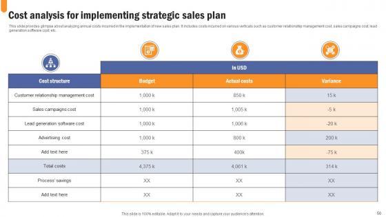 This slide provides glimpse about analyzing annual costs incurred in the implementation of new sales plan. It includes costs incurred on various verticals such as customer relationship management cost, sales campaigns cost, lead generation software cost, etc. Whether you have daily or monthly meetings, a brilliant presentation is necessary. Cost Analysis For Implementing Strategic Developing Extensive Sales And Operations Strategy Ideas Pdf can be your best option for delivering a presentation. Represent everything in detail using Cost Analysis For Implementing Strategic Developing Extensive Sales And Operations Strategy Ideas Pdf and make yourself stand out in meetings. The template is versatile and follows a structure that will cater to your requirements. All the templates prepared by Slidegeeks are easy to download and edit. Our research experts have taken care of the corporate themes as well. So, give it a try and see the results. This slide provides glimpse about analyzing annual costs incurred in the implementation of new sales plan. It includes costs incurred on various verticals such as customer relationship management cost, sales campaigns cost, lead generation software cost, etc.