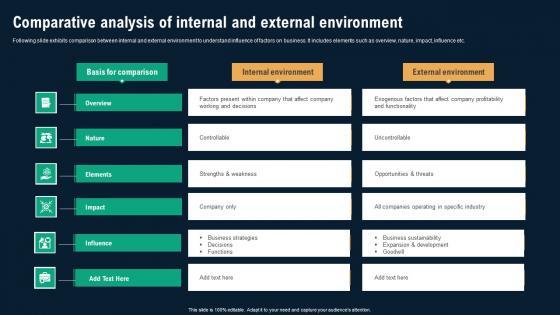 Following slide exhibits comparison between internal and external environment to understand influence of factors on business. It includes elements such as overview, nature, impact, influence etc. Do you have an important presentation coming up Are you looking for something that will make your presentation stand out from the rest Look no further than Comparative Analysis Of Internal And External Environment Business Environmental Analysis Ideas Pdf With our professional designs, you can trust that your presentation will pop and make delivering it a smooth process. And with Slidegeeks, you can trust that your presentation will be unique and memorable. So why wait Grab Comparative Analysis Of Internal And External Environment Business Environmental Analysis Ideas Pdf today and make your presentation stand out from the rest. Following slide exhibits comparison between internal and external environment to understand influence of factors on business. It includes elements such as overview, nature, impact, influence etc.