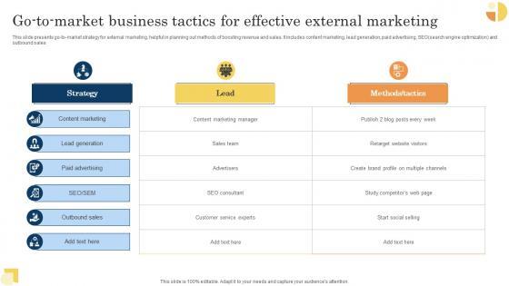This slide presents go to market strategy for external marketing, helpful in planning out methods of boosting revenue and sales. It includes content marketing, lead generation, paid advertising, SEOsearch engine optimization and outbound sales Showcasing this set of slides titled Go To Market Business Tactics For Effective External Marketing Download Pdf. The topics addressed in these templates are Strategy, Lead, Tactics. All the content presented in this PPT design is completely editable. Download it and make adjustments in color, background, font etc. as per your unique business setting. This slide presents go to market strategy for external marketing, helpful in planning out methods of boosting revenue and sales. It includes content marketing, lead generation, paid advertising, SEOsearch engine optimization and outbound sales
