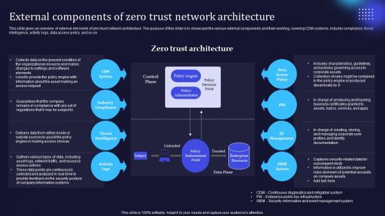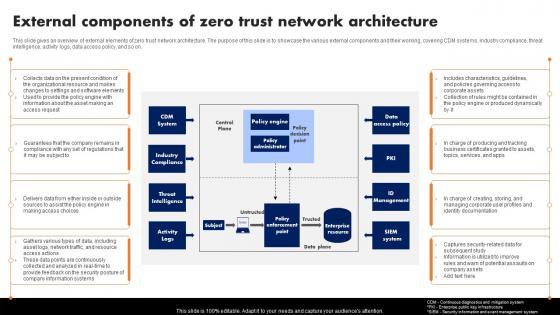 This slide gives an overview of external elements of zero trust network architecture. The purpose of this slide is to showcase the various external components and their working, covering CDM systems, industry compliance, threat intelligence, activity logs, data access policy, and so on. Retrieve professionally designed Zero Trust Network Access External Components Of Zero Trust Network Architecture to effectively convey your message and captivate your listeners. Save time by selecting pre-made slideshows that are appropriate for various topics, from business to educational purposes. These themes come in many different styles, from creative to corporate, and all of them are easily adjustable and can be edited quickly. Access them as PowerPoint templates or as Google Slides themes. You do not have to go on a hunt for the perfect presentation because Slidegeeks got you covered from everywhere. This slide gives an overview of external elements of zero trust network architecture. The purpose of this slide is to showcase the various external components and their working, covering CDM systems, industry compliance, threat intelligence, activity logs, data access policy, and so on.