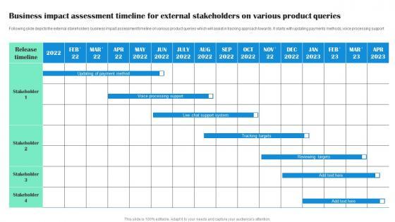 Following slide depicts the external stakeholders business impact assessment timeline on various product queries which will assist in tracking approach towards. It starts with updating payments methods, voice processing support Pitch your topic with ease and precision using this Business Impact Assessment Timeline For External Stakeholders On Various Product Queries Rules Pdf This layout presents information on Release Timeline, Stakeholder, Product Queries It is also available for immediate download and adjustment. So, changes can be made in the color, design, graphics or any other component to create a unique layout. Following slide depicts the external stakeholders business impact assessment timeline on various product queries which will assist in tracking approach towards. It starts with updating payments methods, voice processing support