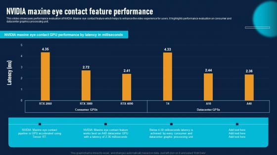 This slides showcases performance evaluation of NVIDIA Maxine eye contact feature which helps to enhance the video experience for users. It highlights performance evaluation on consumer and datacenter graphics processing unit. Want to ace your presentation in front of a live audience Our NVIDIA AI To Improve Virtual Communication NVIDIA Maxine Eye Contact Feature Background Pdf can help you do that by engaging all the users towards you. Slidegeeks experts have put their efforts and expertise into creating these impeccable powerpoint presentations so that you can communicate your ideas clearly. Moreover, all the templates are customizable, and easy to edit and downloadable. Use these for both personal and commercial use. This slides showcases performance evaluation of NVIDIA Maxine eye contact feature which helps to enhance the video experience for users. It highlights performance evaluation on consumer and datacenter graphics processing unit.
