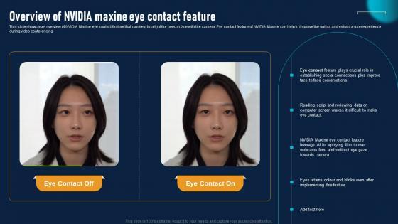 This slide showcases overview of NVIDIA Maxine eye contact feature that can help to alight the person face with the camera. Eye contact feature of NVIDIA Maxine can help to improve the output and enhance user experience during video conferencing There are so many reasons you need a NVIDIA AI To Improve Virtual Communication Overview NVIDIA Maxine Eye Contact Pictures Pdf. The first reason is you can not spend time making everything from scratch, Thus, Slidegeeks has made presentation templates for you too. You can easily download these templates from our website easily. This slide showcases overview of NVIDIA Maxine eye contact feature that can help to alight the person face with the camera. Eye contact feature of NVIDIA Maxine can help to improve the output and enhance user experience during video conferencing