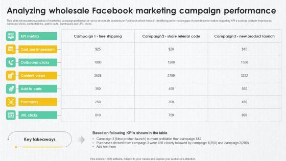 This slide showcases evaluation of marketing campaign performance run by wholesale business on Facebook which helps in identifying performance gaps. It provides information regarding KPIs such as cost per impression, outbound clicks, content views, add to carts, purchases and URL clicks. Get a simple yet stunning designed B2B Marketing Techniques Analyzing Wholesale Facebook Marketing Campaign. It is the best one to establish the tone in your meetings. It is an excellent way to make your presentations highly effective. So, download this PPT today from Slidegeeks and see the positive impacts. Our easy-to-edit B2B Marketing Techniques Analyzing Wholesale Facebook Marketing Campaign can be your go-to option for all upcoming conferences and meetings. So, what are you waiting for Grab this template today. This slide showcases evaluation of marketing campaign performance run by wholesale business on Facebook which helps in identifying performance gaps. It provides information regarding KPIs such as cost per impression, outbound clicks, content views, add to carts, purchases and URL clicks.