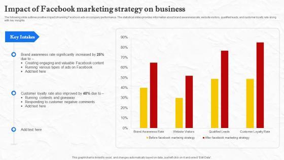 The following slide outlines positive impact of running Facebook ads on company performance. The statistical slides provides information about brand awareness rate, website visitors, qualified leads, and customer loyalty rate along with key insights. This Facebook Marketing Techniques Impact Of Facebook Marketing Strategy On Business Strategy SS V from Slidegeeks makes it easy to present information on your topic with precision. It provides customization options, so you can make changes to the colors, design, graphics, or any other component to create a unique layout. It is also available for immediate download, so you can begin using it right away. Slidegeeks has done good research to ensure that you have everything you need to make your presentation stand out. Make a name out there for a brilliant performance. The following slide outlines positive impact of running Facebook ads on company performance. The statistical slides provides information about brand awareness rate, website visitors, qualified leads, and customer loyalty rate along with key insights.