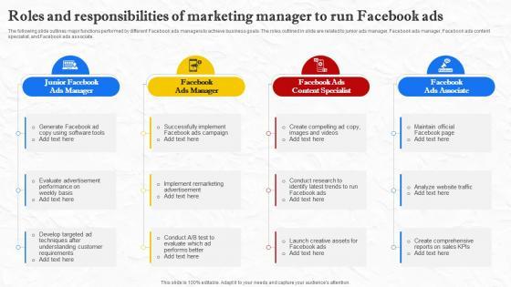 The following slide outlines major functions performed by different Facebook ads managers to achieve business goals. The roles outlined in slide are related to junior ads manager, Facebook ads manager, Facebook ads content specialist, and Facebook ads associate. Get a simple yet stunning designed Facebook Marketing Techniques Roles And Responsibilities Of Marketing Manager Strategy SS V. It is the best one to establish the tone in your meetings. It is an excellent way to make your presentations highly effective. So, download this PPT today from Slidegeeks and see the positive impacts. Our easy-to-edit Facebook Marketing Techniques Roles And Responsibilities Of Marketing Manager Strategy SS V can be your go-to option for all upcoming conferences and meetings. So, what are you waiting for Grab this template today. The following slide outlines major functions performed by different Facebook ads managers to achieve business goals. The roles outlined in slide are related to junior ads manager, Facebook ads manager, Facebook ads content specialist, and Facebook ads associate.