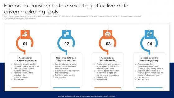 This slide represents the factors to be kept in mind by marketers at the time of choosing data analytics tool to optimize enterprises marketing strategy. It includes factors such as accounts for customer experience and outside trends etc.Boost your pitch with our creative Factors To Consider Before Selecting Effective Guide For Data Driven Advertising Microsoft Pdf. Deliver an awe-inspiring pitch that will mesmerize everyone. Using these presentation templates you will surely catch everyones attention. You can browse the ppts collection on our website. We have researchers who are experts at creating the right content for the templates. So you do not have to invest time in any additional work. Just grab the template now and use them. This slide represents the factors to be kept in mind by marketers at the time of choosing data analytics tool to optimize enterprises marketing strategy. It includes factors such as accounts for customer experience and outside trends etc.