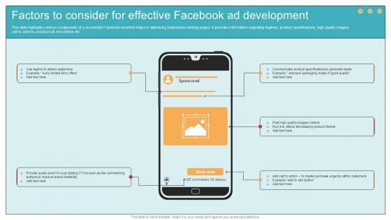 This slide highlights various components of a successful Facebook ad which helps in optimizing businesses landing pages. It provides information regarding taglines, product specifications, high quality images, call to actions, social proof, live videos etc. Are you searching for a B2B Marketing Techniques Factors To Consider For Effective Facebook Ad Development that is uncluttered, straightforward, and original Its easy to edit, and you can change the colors to suit your personal or business branding. For a presentation that expresses how much effort you have put in, this template is ideal With all of its features, including tables, diagrams, statistics, and lists, its perfect for a business plan presentation. Make your ideas more appealing with these professional slides. Download B2B Marketing Techniques Factors To Consider For Effective Facebook Ad Development from Slidegeeks today. This slide highlights various components of a successful Facebook ad which helps in optimizing businesses landing pages. It provides information regarding taglines, product specifications, high quality images, call to actions, social proof, live videos etc.