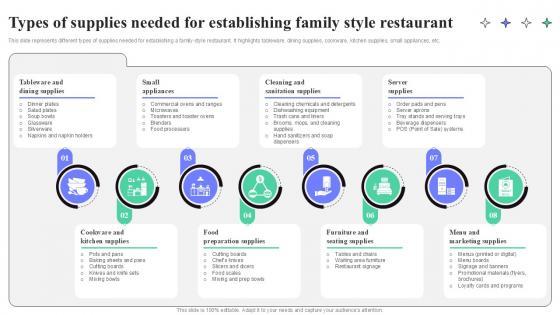This slide represents different types of supplies needed for establishing a family-style restaurant. It highlights tableware, dining supplies, cookware, kitchen supplies, small appliances, etc. Whether you have daily or monthly meetings, a brilliant presentation is necessary. Types Of Supplies Needed For Establishing Family Style Strategic Guide To Launching Ppt Template can be your best option for delivering a presentation. Represent everything in detail using Types Of Supplies Needed For Establishing Family Style Strategic Guide To Launching Ppt Template and make yourself stand out in meetings. The template is versatile and follows a structure that will cater to your requirements. All the templates prepared by Slidegeeks are easy to download and edit. Our research experts have taken care of the corporate themes as well. So, give it a try and see the results. This slide represents different types of supplies needed for establishing a family-style restaurant. It highlights tableware, dining supplies, cookware, kitchen supplies, small appliances, etc.