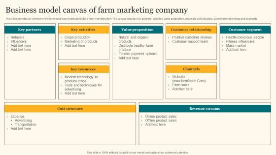 This slide provides an overview of the farm business model canvas for a farm marketing firm. The canvas includes key partners, activities, value proposition, channels, cost structure, customer relationships and segments. Get a simple yet stunning designed Business Model Canvas Of Farm Marketing Agricultural Product Promotion Microsoft Pdf. It is the best one to establish the tone in your meetings. It is an excellent way to make your presentations highly effective. So, download this PPT today from Slidegeeks and see the positive impacts. Our easy-to-edit Business Model Canvas Of Farm Marketing Agricultural Product Promotion Microsoft Pdf can be your go-to option for all upcoming conferences and meetings. So, what are you waiting for Grab this template today. This slide provides an overview of the farm business model canvas for a farm marketing firm. The canvas includes key partners, activities, value proposition, channels, cost structure, customer relationships and segments.