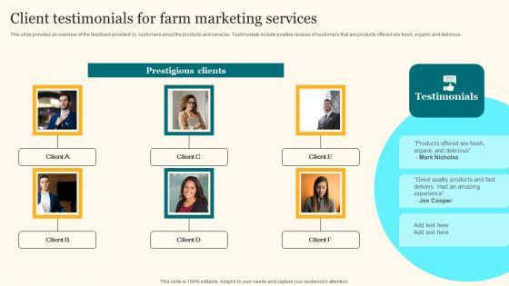This slide provides an overview of the feedback provided by customers about the products and services. Testimonials include positive reviews of customers that are products offered are fresh, organic and delicious. Do you have an important presentation coming up Are you looking for something that will make your presentation stand out from the rest Look no further than Client Testimonials For Farm Marketing Services Agricultural Product Promotion Microsoft Pdf. With our professional designs, you can trust that your presentation will pop and make delivering it a smooth process. And with Slidegeeks, you can trust that your presentation will be unique and memorable. So why wait Grab Client Testimonials For Farm Marketing Services Agricultural Product Promotion Microsoft Pdf today and make your presentation stand out from the rest This slide provides an overview of the feedback provided by customers about the products and services. Testimonials include positive reviews of customers that are products offered are fresh, organic and delicious.