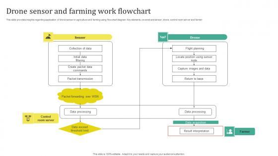 This slide provides insights regarding application of drone sensor in agriculture and farming using flowchart diagram. Key elements covered are sensor, drone, control room server and farmer. Pitch your topic with ease and precision using this Drone Sensor And Farming Work Flowchart Portrait Pdf. This layout presents information on Sensor, Drone, Farmer. It is also available for immediate download and adjustment. So, changes can be made in the color, design, graphics or any other component to create a unique layout. This slide provides insights regarding application of drone sensor in agriculture and farming using flowchart diagram. Key elements covered are sensor, drone, control room server and farmer.