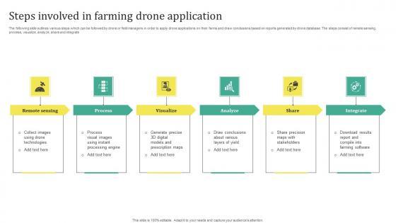The following slide outlines various steps which can be followed by drone or field managers in order to apply drone applications on their farms and draw conclusions based on reports generated by drone database. The steps consist of remote sensing, process, visualize, analyze, share and integrate. Showcasing this set of slides titled Steps Involved In Farming Drone Application Portrait Pdf. The topics addressed in these templates are Remote Sensing, Process, Visualize. All the content presented in this PPT design is completely editable. Download it and make adjustments in color, background, font etc. as per your unique business setting. The following slide outlines various steps which can be followed by drone or field managers in order to apply drone applications on their farms and draw conclusions based on reports generated by drone database. The steps consist of remote sensing, process, visualize, analyze, share and integrate.