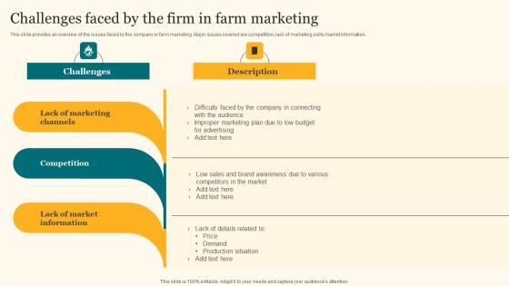 This slide provides an overview of the issues faced by the company in farm marketing. Major issues covered are competition, lack of marketing skills market information. Slidegeeks is here to make your presentations a breeze with Challenges Faced By The Firm In Farm Marketing Agricultural Product Promotion Summary Pdf With our easy-to-use and customizable templates, you can focus on delivering your ideas rather than worrying about formatting. With a variety of designs to choose from, you are sure to find one that suits your needs. And with animations and unique photos, illustrations, and fonts, you can make your presentation pop. So whether you are giving a sales pitch or presenting to the board, make sure to check out Slidegeeks first This slide provides an overview of the issues faced by the company in farm marketing. Major issues covered are competition, lack of marketing skills market information.