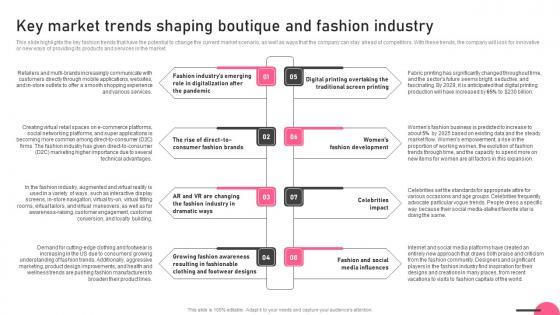 This slide highlights the key fashion trends that have the potential to change the current market scenario, as well as ways that the company can stay ahead of competitors. With these trends, the company will look for innovative or new ways of providing its products and services in the market. Explore a selection of the finest Key Market Trends Shaping Boutique And Fashion Industry Boutique Business Clipart Pdf here. With a plethora of professionally designed and pre-made slide templates, you can quickly and easily find the right one for your upcoming presentation. You can use our Key Market Trends Shaping Boutique And Fashion Industry Boutique Business Clipart Pdf to effectively convey your message to a wider audience. Slidegeeks has done a lot of research before preparing these presentation templates. The content can be personalized and the slides are highly editable. Grab templates today from Slidegeeks. This slide highlights the key fashion trends that have the potential to change the current market scenario, as well as ways that the company can stay ahead of competitors. With these trends, the company will look for innovative or new ways of providing its products and services in the market.