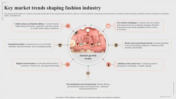 The purpose of this slide is to conduct a thorough assessment of the market trends in fashion business. It will be useful for researching market dynamics, including market forecasting, potential consumer categories, purchasing habits, competition etc. Retrieve professionally designed Key Market Trends Shaping Fashion Industry Fashion Startup Roadmap Plan Ppt Presentation BP SS V to effectively convey your message and captivate your listeners. Save time by selecting pre-made slideshows that are appropriate for various topics, from business to educational purposes. These themes come in many different styles, from creative to corporate, and all of them are easily adjustable and can be edited quickly. Access them as PowerPoint templates or as Google Slides themes. You do not have to go on a hunt for the perfect presentation because Slidegeeks got you covered from everywhere. The purpose of this slide is to conduct a thorough assessment of the market trends in fashion business. It will be useful for researching market dynamics, including market forecasting, potential consumer categories, purchasing habits, competition etc.