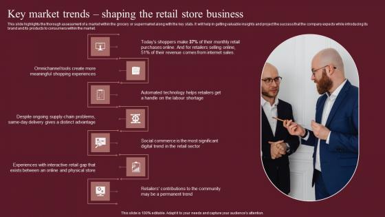 This slide highlights the thorough assessment of a market within the grocery or supermarket along with the key stats. It will help in getting valuable insights and project the success that the company expects while introducing its brand and its products to consumers within the market. Explore a selection of the finest Key Market Trends Shaping The Retail Store Business Fashion Business Plan Inspiration Pdf here. With a plethora of professionally designed and pre-made slide templates, you can quickly and easily find the right one for your upcoming presentation. You can use our Key Market Trends Shaping The Retail Store Business Fashion Business Plan Inspiration Pdf to effectively convey your message to a wider audience. Slidegeeks has done a lot of research before preparing these presentation templates. The content can be personalized and the slides are highly editable. Grab templates today from Slidegeeks. This slide highlights the thorough assessment of a market within the grocery or supermarket along with the key stats. It will help in getting valuable insights and project the success that the company expects while introducing its brand and its products to consumers within the market.