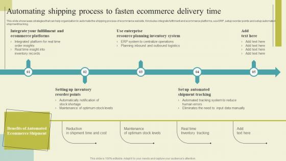 This slide showcases strategies that can help organization to automate the shipping process of ecommerce website. It includes integrate fulfilment and ecommerce platforms, use ERP, setup reorder points and setup automated shipment tracking. Here you can discover an assortment of the finest PowerPoint and Google Slides templates. With these templates, you can create presentations for a variety of purposes while simultaneously providing your audience with an eye catching visual experience. Download Automating Shipping Process To Fasten Ecommerce Delivery Time Introduction PDF to deliver an impeccable presentation. These templates will make your job of preparing presentations much quicker, yet still, maintain a high level of quality. Slidegeeks has experienced researchers who prepare these templates and write high quality content for you. Later on, you can personalize the content by editing the Automating Shipping Process To Fasten Ecommerce Delivery Time Introduction PDF.