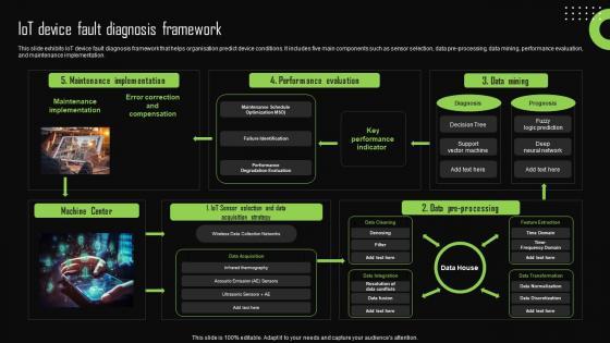 This slide exhibits IoT device fault diagnosis framework that helps organisation predict device conditions. It includes five main components such as sensor selection, data pre-processing, data mining, performance evaluation, and maintenance implementation. This IoT Device Management Fundamentals IoT Device Fault Diagnosis Framework IoT SS V from Slidegeeks makes it easy to present information on your topic with precision. It provides customization options, so you can make changes to the colors, design, graphics, or any other component to create a unique layout. It is also available for immediate download, so you can begin using it right away. Slidegeeks has done good research to ensure that you have everything you need to make your presentation stand out. Make a name out there for a brilliant performance. This slide exhibits IoT device fault diagnosis framework that helps organisation predict device conditions. It includes five main components such as sensor selection, data pre-processing, data mining, performance evaluation, and maintenance implementation.
