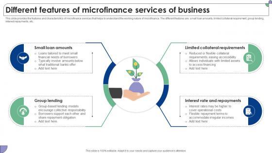 This slide provides the features and characteristics of microfinance services that helps to understand the working nature of microfinance. The different features are small loan amounts, limited collateral requirement, group lending, interest repayments, etc. Get a simple yet stunning designed Different Features Of Microfinance Services Of Business Complete Guide To Microfinance Fin SS V. It is the best one to establish the tone in your meetings. It is an excellent way to make your presentations highly effective. So, download this PPT today from Slidegeeks and see the positive impacts. Our easy-to-edit Different Features Of Microfinance Services Of Business Complete Guide To Microfinance Fin SS V can be your go-to option for all upcoming conferences and meetings. So, what are you waiting for Grab this template today. This slide provides the features and characteristics of microfinance services that helps to understand the working nature of microfinance. The different features are small loan amounts, limited collateral requirement, group lending, interest repayments, etc.