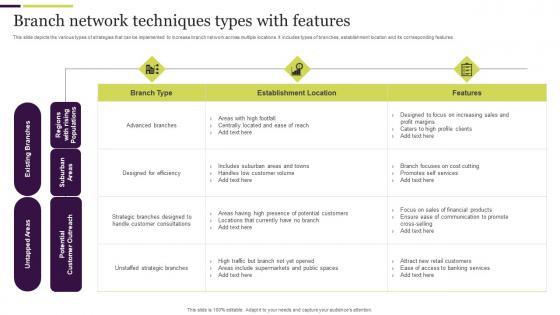 This slide depicts the various types of strategies that can be implemented to increase branch network across multiple locations. It includes types of branches, establishment location and its corresponding features. Showcasing this set of slides titled Branch Network Techniques Types With Features Topics Pdf. The topics addressed in these templates are Existing Branches, Potential Customer Outreach, Branch Network Techniques. All the content presented in this PPT design is completely editable. Download it and make adjustments in color, background, font etc. as per your unique business setting. This slide depicts the various types of strategies that can be implemented to increase branch network across multiple locations. It includes types of branches, establishment location and its corresponding features.
