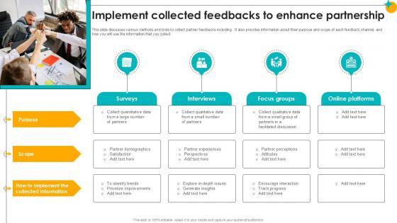This slide discusses various methods and tools to collect partner feedbacks including . It also provides information about their purpose and scope of each feedback channel, and how you will use the information that you collect. Do you have an important presentation coming up Are you looking for something that will make your presentation stand out from the rest Look no further than Implement Collected Feedbacks To Enhance Partnership Partner Relationship Ppt Sample. With our professional designs, you can trust that your presentation will pop and make delivering it a smooth process. And with Slidegeeks, you can trust that your presentation will be unique and memorable. So why wait Grab Implement Collected Feedbacks To Enhance Partnership Partner Relationship Ppt Sample today and make your presentation stand out from the rest This slide discusses various methods and tools to collect partner feedbacks including . It also provides information about their purpose and scope of each feedback channel, and how you will use the information that you collect.