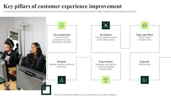 This slide illustrates the key principles that helps in the building blocks for customer experience success. It includes personalization, integrity, empathy that helps in getting business results. Retrieve professionally designed Client Feedback Strategies Key Pillars Of Customer Experience Improvement Download Pdf to effectively convey your message and captivate your listeners. Save time by selecting pre made slideshows that are appropriate for various topics, from business to educational purposes. These themes come in many different styles, from creative to corporate, and all of them are easily adjustable and can be edited quickly. Access them as PowerPoint templates or as Google Slides themes. You do not have to go on a hunt for the perfect presentation because Slidegeeks got you covered from everywhere. This slide illustrates the key principles that helps in the building blocks for customer experience success. It includes personalization, integrity, empathy that helps in getting business results.