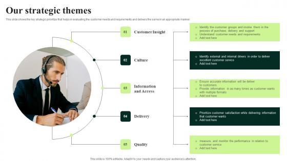 This slide shows the key strategic prioritize that helps in evaluating the customer needs and requirements and delivers the same in an appropriate manner. Here you can discover an assortment of the finest PowerPoint and Google Slides templates. With these templates, you can create presentations for a variety of purposes while simultaneously providing your audience with an eye catching visual experience. Download Client Feedback Strategies Our Strategic Themes Icons Pdf to deliver an impeccable presentation. These templates will make your job of preparing presentations much quicker, yet still, maintain a high level of quality. Slidegeeks has experienced researchers who prepare these templates and write high quality content for you. Later on, you can personalize the content by editing the Client Feedback Strategies Our Strategic Themes Icons Pdf. This slide shows the key strategic prioritize that helps in evaluating the customer needs and requirements and delivers the same in an appropriate manner.