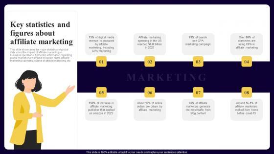 This slide showcases the major statistic and global data about the impact of affiliate marketing on business operations. It provides information regarding global market share, impact on online order, affiliate marketing spending, source of affiliate marketing, etc Take your projects to the next level with our ultimate collection of Strategies For Implementing CPA Marketing Key Statistics And Figures About Affiliate Marketing Elements PDF.zip. Slidegeeks has designed a range of layouts that are perfect for representing task or activity duration, keeping track of all your deadlines at a glance. Tailor these designs to your exact needs and give them a truly corporate look with your own brand colors they will make your projects stand out from the rest