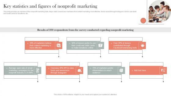 This slide provides an overview of the nonprofit marketing stats. Major stats covered are marketers find content marketing more effective, funds raised through Instagram, donors use debit and credit cards for donations, etc.This Key Statistics And Figures Of Nonprofit Marketing Efficient Nonprofit Marketing Designs Pdf from Slidegeeks makes it easy to present information on your topic with precision. It provides customization options, so you can make changes to the colors, design, graphics, or any other component to create a unique layout. It is also available for immediate download, so you can begin using it right away. Slidegeeks has done good research to ensure that you have everything you need to make your presentation stand out. Make a name out there for a brilliant performance. This slide provides an overview of the nonprofit marketing stats. Major stats covered are marketers find content marketing more effective, funds raised through Instagram, donors use debit and credit cards for donations, etc.