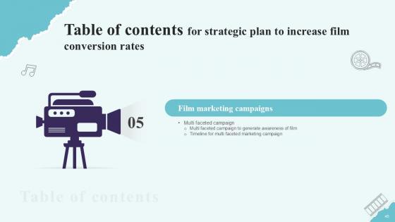 Do you have an important presentation coming up Are you looking for something that will make your presentation stand out from the rest Look no further than Table Of Contents Strategic Plan To Increase Film Conversion Rates Ppt Sample Strategy SS V. With our professional designs, you can trust that your presentation will pop and make delivering it a smooth process. And with Slidegeeks, you can trust that your presentation will be unique and memorable. So why wait Grab Table Of Contents Strategic Plan To Increase Film Conversion Rates Ppt Sample Strategy SS V today and make your presentation stand out from the rest Our Table Of Contents Strategic Plan To Increase Film Conversion Rates Ppt Sample Strategy SS V are topically designed to provide an attractive backdrop to any subject. Use them to look like a presentation pro.