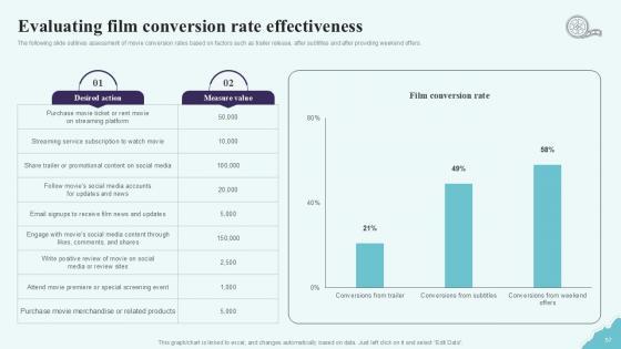 The following slide outlines assessment of movie conversion rates based on factors such as trailer release, after subtitles and after providing weekend offers. Do you have an important presentation coming up Are you looking for something that will make your presentation stand out from the rest Look no further than Marketing Channels For Movie Evaluating Film Conversion Rate Effectiveness Strategy SS V. With our professional designs, you can trust that your presentation will pop and make delivering it a smooth process. And with Slidegeeks, you can trust that your presentation will be unique and memorable. So why wait Grab Marketing Channels For Movie Evaluating Film Conversion Rate Effectiveness Strategy SS V today and make your presentation stand out from the rest. The following slide outlines assessment of movie conversion rates based on factors such as trailer release, after subtitles and after providing weekend offers.