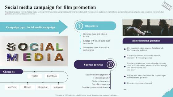 This slide showcases sample of social media campaign for film promotion using multiple platforms to create buzz and interest among audience. It highlights key components such as campaign type, objectives, implementation guidelines, channels and success metrics. Whether you have daily or monthly meetings, a brilliant presentation is necessary. Social Media Campaign For Film Promotion Strategic Plan To Increase Film Ppt Slides Strategy SS V can be your best option for delivering a presentation. Represent everything in detail using Social Media Campaign For Film Promotion Strategic Plan To Increase Film Ppt Slides Strategy SS V and make yourself stand out in meetings. The template is versatile and follows a structure that will cater to your requirements. All the templates prepared by Slidegeeks are easy to download and edit. Our research experts have taken care of the corporate themes as well. So, give it a try and see the results. This slide showcases sample of social media campaign for film promotion using multiple platforms to create buzz and interest among audience. It highlights key components such as campaign type, objectives, implementation guidelines, channels and success metrics.