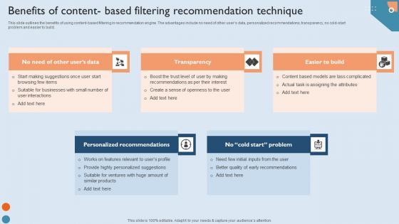 This slide outlines the benefits of using content-based filtering in recommendation engine. The advantages include no need of other users data, personalized recommendations, transparency, no cold-start problem and easier to build.Do you have an important presentation coming up Are you looking for something that will make your presentation stand out from the rest Look no further than Benefits Of Content Based Filtering Recommendation Technique Integrating Recommender System To Enhance Information PDF. With our professional designs, you can trust that your presentation will pop and make delivering it a smooth process. And with Slidegeeks, you can trust that your presentation will be unique and memorable. So why wait Grab Benefits Of Content Based Filtering Recommendation Technique Integrating Recommender System To Enhance Information PDF today and make your presentation stand out from the rest