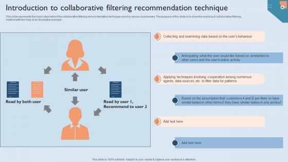 This slide represents the basic idea behind the collaborative filtering recommendation technique used by various businesses. The purpose of this slide is to show the working of collaborative filtering method with the help of an illustrative example.Here you can discover an assortment of the finest PowerPoint and Google Slides templates. With these templates, you can create presentations for a variety of purposes while simultaneously providing your audience with an eye-catching visual experience. Download Introduction To Collaborative Filtering Recommendation Technique Integrating Recommender System To Enhance Rules PDF to deliver an impeccable presentation. These templates will make your job of preparing presentations much quicker, yet still, maintain a high level of quality. Slidegeeks has experienced researchers who prepare these templates and write high-quality content for you. Later on, you can personalize the content by editing the Introduction To Collaborative Filtering Recommendation Technique Integrating Recommender System To Enhance Rules PDF.