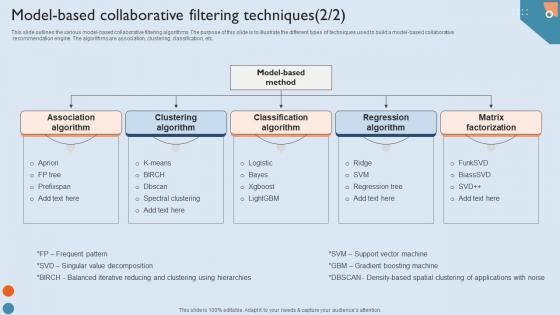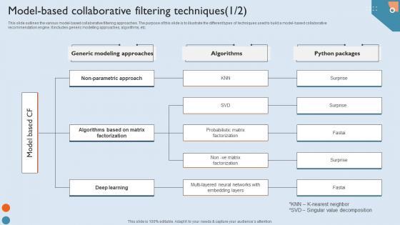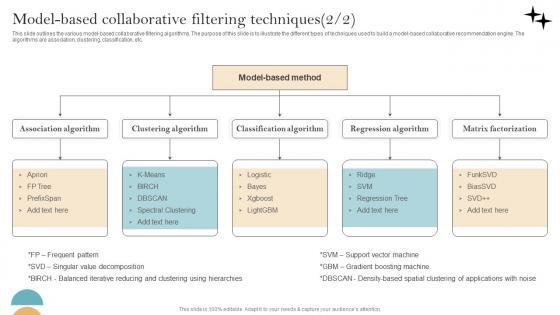 This slide outlines the various model-based collaborative filtering approaches. The purpose of this slide is to illustrate the different types of techniques used to build a model-based collaborative recommendation engine. It includes generic modelling approaches, algorithms, etc.From laying roadmaps to briefing everything in detail, our templates are perfect for you. You can set the stage with your presentation slides. All you have to do is download these easy-to-edit and customizable templates. Model Based Collaborative Filtering Techniques Integrating Recommender System To Enhance Guidelines PDF will help you deliver an outstanding performance that everyone would remember and praise you for. Do download this presentation today.