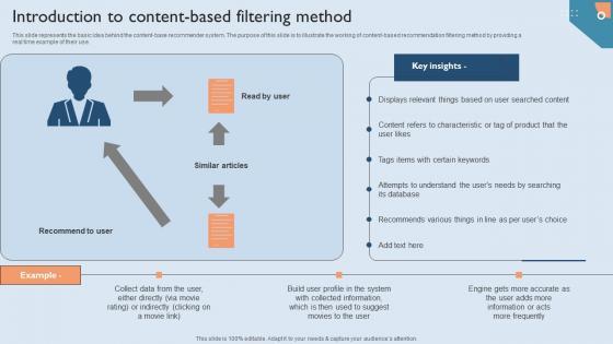 This slide represents the basic idea behind the content-base recommender system. The purpose of this slide is to illustrate the working of content-based recommendation filtering method by providing a real time example of their use. Take your projects to the next level with our ultimate collection of Recommendation Techniques Introduction To Content Based Filtering Method Diagrams PDF. Slidegeeks has designed a range of layouts that are perfect for representing task or activity duration, keeping track of all your deadlines at a glance. Tailor these designs to your exact needs and give them a truly corporate look with your own brand colors they will make your projects stand out from the rest This slide represents the basic idea behind the content-base recommender system. The purpose of this slide is to illustrate the working of content-based recommendation filtering method by providing a real time example of their use.