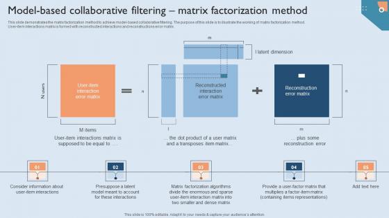 This slide demonstrates the matrix factorization method to achieve model-based collaborative filtering. The purpose of this slide is to illustrate the working of matrix factorization method. User-item interactions matrix is formed with reconstructed interactions and reconstructions error matrix. Get a simple yet stunning designed Recommendation Techniques Model Based Collaborative Filtering Matrix Factorization Ideas PDF. It is the best one to establish the tone in your meetings. It is an excellent way to make your presentations highly effective. So, download this PPT today from Slidegeeks and see the positive impacts. Our easy-to-edit Recommendation Techniques Model Based Collaborative Filtering Matrix Factorization Ideas PDF can be your go-to option for all upcoming conferences and meetings. So, what are you waiting for Grab this template today. This slide demonstrates the matrix factorization method to achieve model-based collaborative filtering. The purpose of this slide is to illustrate the working of matrix factorization method. User-item interactions matrix is formed with reconstructed interactions and reconstructions error matrix.