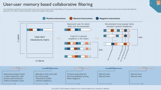 This slide talks about the basic idea behind user-user memory based collaborative filtering. The purpose of this slide is to demonstrate the working of user-centred memory based collaborative filtering approach. The matrix consists of positive, neutral and negative interactions. Welcome to our selection of the Recommendation Techniques User User Memory Based Collaborative Filtering Guidelines PDF. These are designed to help you showcase your creativity and bring your sphere to life. Planning and Innovation are essential for any business that is just starting out. This collection contains the designs that you need for your everyday presentations. All of our PowerPoints are 100 percent editable, so you can customize them to suit your needs. This multi-purpose template can be used in various situations. Grab these presentation templates today This slide talks about the basic idea behind user-user memory based collaborative filtering. The purpose of this slide is to demonstrate the working of user-centred memory based collaborative filtering approach. The matrix consists of positive, neutral and negative interactions.
