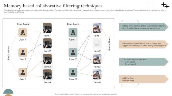 This slide talks about the memory based collaborative filtering method. The purpose of this slide is to provide the visualization of two memory based collaborative filtering techniques. These methods include user based and item based collaborative filtering. Slidegeeks is one of the best resources for PowerPoint templates. You can download easily and regulate Memory Based Collaborative Filtering Techniques Use Cases Of Filtering Methods Rules Pdf for your personal presentations from our wonderful collection. A few clicks is all it takes to discover and get the most relevant and appropriate templates. Use our Templates to add a unique zing and appeal to your presentation and meetings. All the slides are easy to edit and you can use them even for advertisement purposes. This slide talks about the memory based collaborative filtering method. The purpose of this slide is to provide the visualization of two memory based collaborative filtering techniques. These methods include user based and item based collaborative filtering.