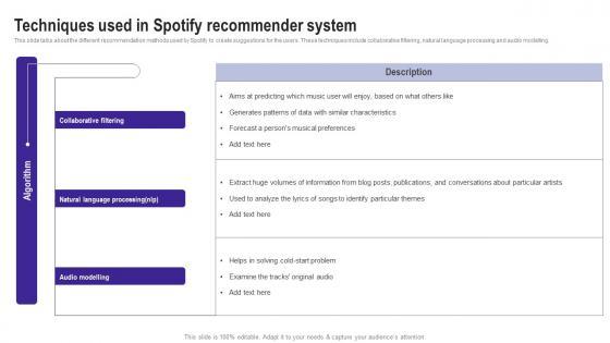 This slide talks about the different recommendation methods used by Spotify to create suggestions for the users. These techniques include collaborative filtering, natural language processing and audio modelling. Explore a selection of the finest Techniques Used In Spotify Recommender System Use Cases Of Filtering Methods Designs Pdf here. With a plethora of professionally designed and pre made slide templates, you can quickly and easily find the right one for your upcoming presentation. You can use our Techniques Used In Spotify Recommender System Use Cases Of Filtering Methods Designs Pdf to effectively convey your message to a wider audience. Slidegeeks has done a lot of research before preparing these presentation templates. The content can be personalized and the slides are highly editable. Grab templates today from Slidegeeks. This slide talks about the different recommendation methods used by Spotify to create suggestions for the users. These techniques include collaborative filtering, natural language processing and audio modelling.