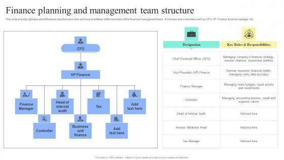 This slide provides glimpse about the team structure and roles and responsibilities of the members of the financial management team . It includes team members such as CFO, VP Finance, finance manager, etc. Explore a selection of the finest Strategic Financial Planning And Administration Finance Planning And Management Team Designs PDF here. With a plethora of professionally designed and pre-made slide templates, you can quickly and easily find the right one for your upcoming presentation. You can use our Strategic Financial Planning And Administration Finance Planning And Management Team Designs PDF to effectively convey your message to a wider audience. Slidegeeks has done a lot of research before preparing these presentation templates. The content can be personalized and the slides are highly editable. Grab templates today from Slidegeeks. This slide provides glimpse about the team structure and roles and responsibilities of the members of the financial management team . It includes team members such as CFO, VP Finance, finance manager, etc.